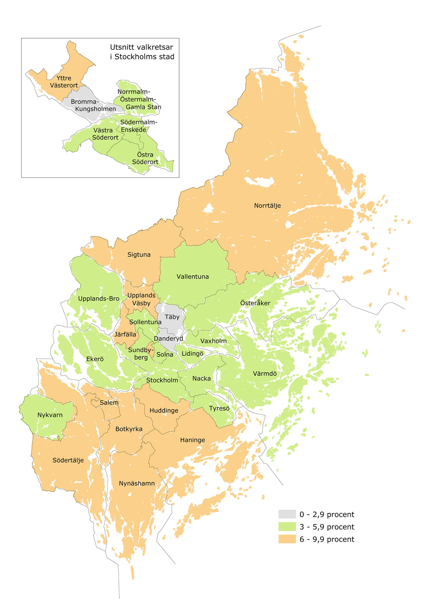 Det finns skillnader i andelen rökare mellan länets kommuner (Karta 11.1). Lägst andel rökare finns i Danderyd (1,7 procent), Täby (2,2 procent), Nacka (3,3 procent) och Vallentuna (3,3 procent), medan den högsta andelen finns i Nynäshamn (8,4 procent), Botkyrka (8,7 procent) och Södertälje (8,8 procent).