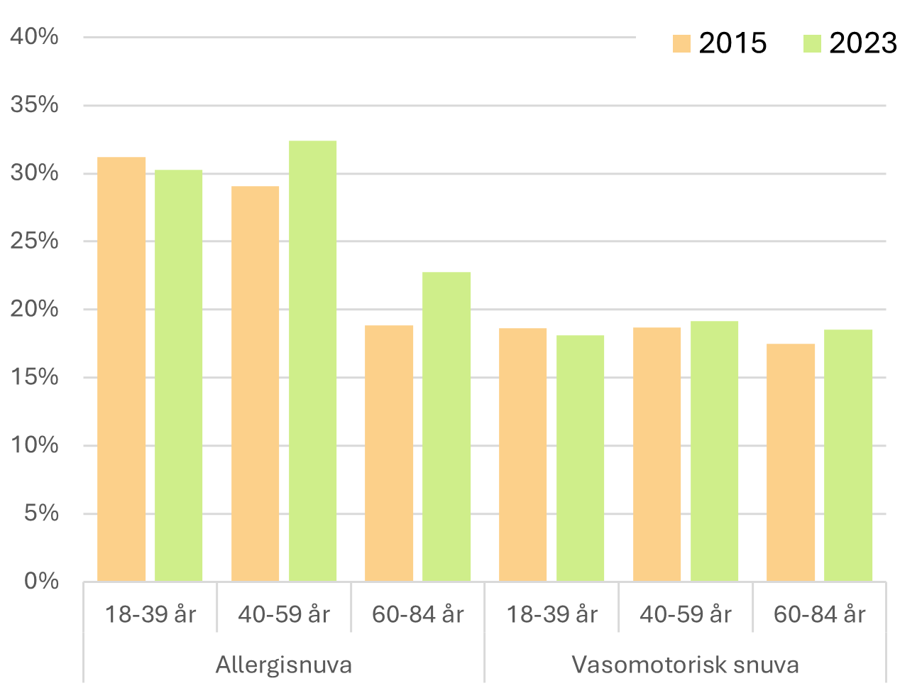 Figur 12.4 visar förekomsten av allergisnuva och vasomotorisk snuva år 2023 jämfört med 2015 i olika åldersgrupper i Stockholms län. Figuren visar att allergisnuva är vanligare än vasomotorisk snuva. Andelen som har allergisnuva är lägre i åldersgruppen 60–84 år (23 %) jämfört med i åldersgrupperna 18–39 år (30 %) och 40–59 år (32%), medan vasomotorisk snuva är ungeför lika vanligt i alla åldersgrupper.