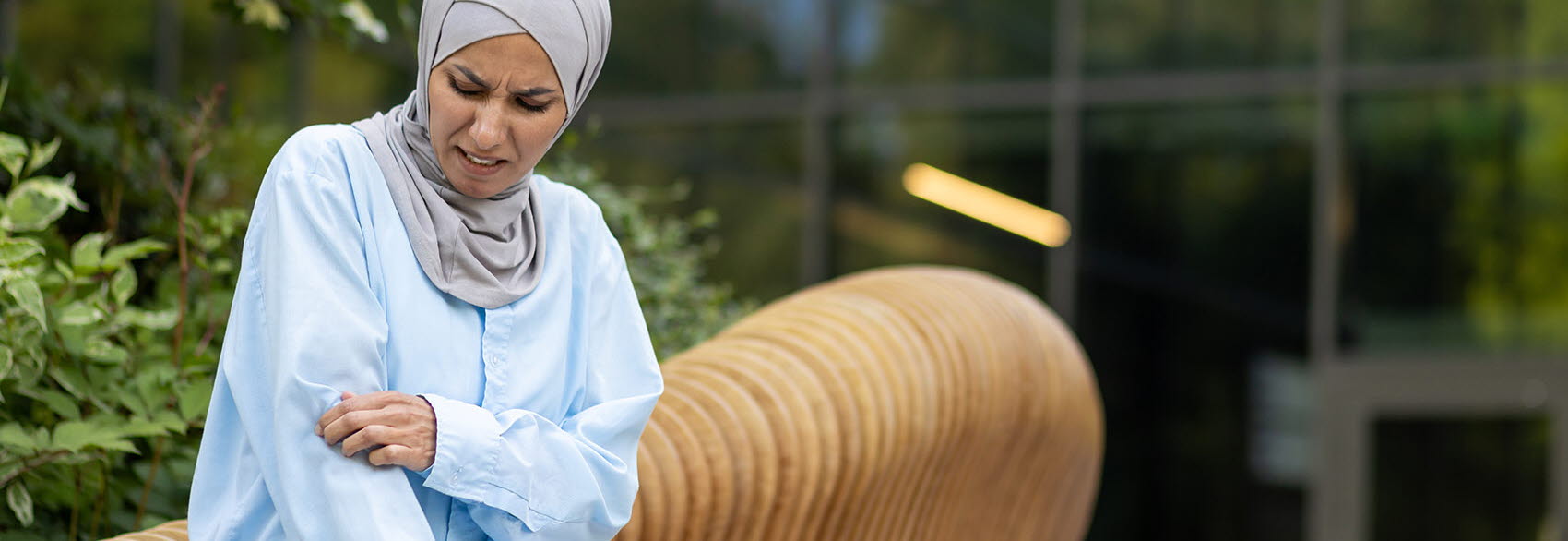 Fotografi av en kvinna som sitter på en parkbänk och kliar sig på armen med ett besvärat ansiktsuttryck.