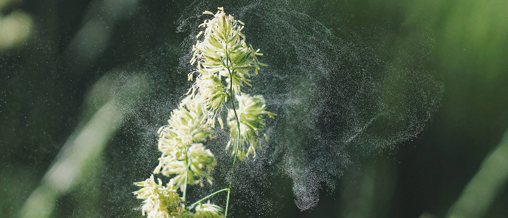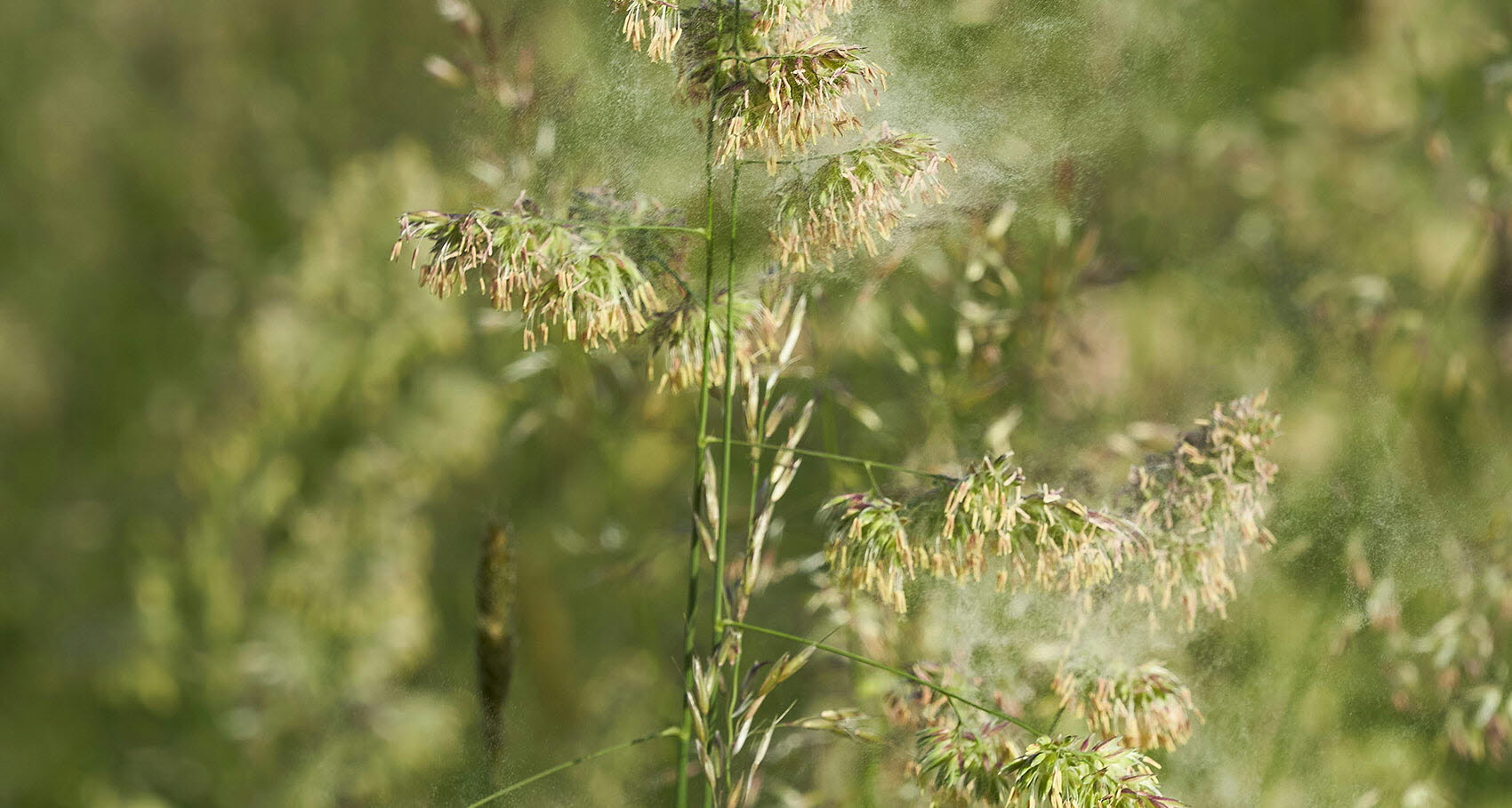 Fotografi, närbild av ett grässtrå som släpper ifrån sig ett moln av pollen.