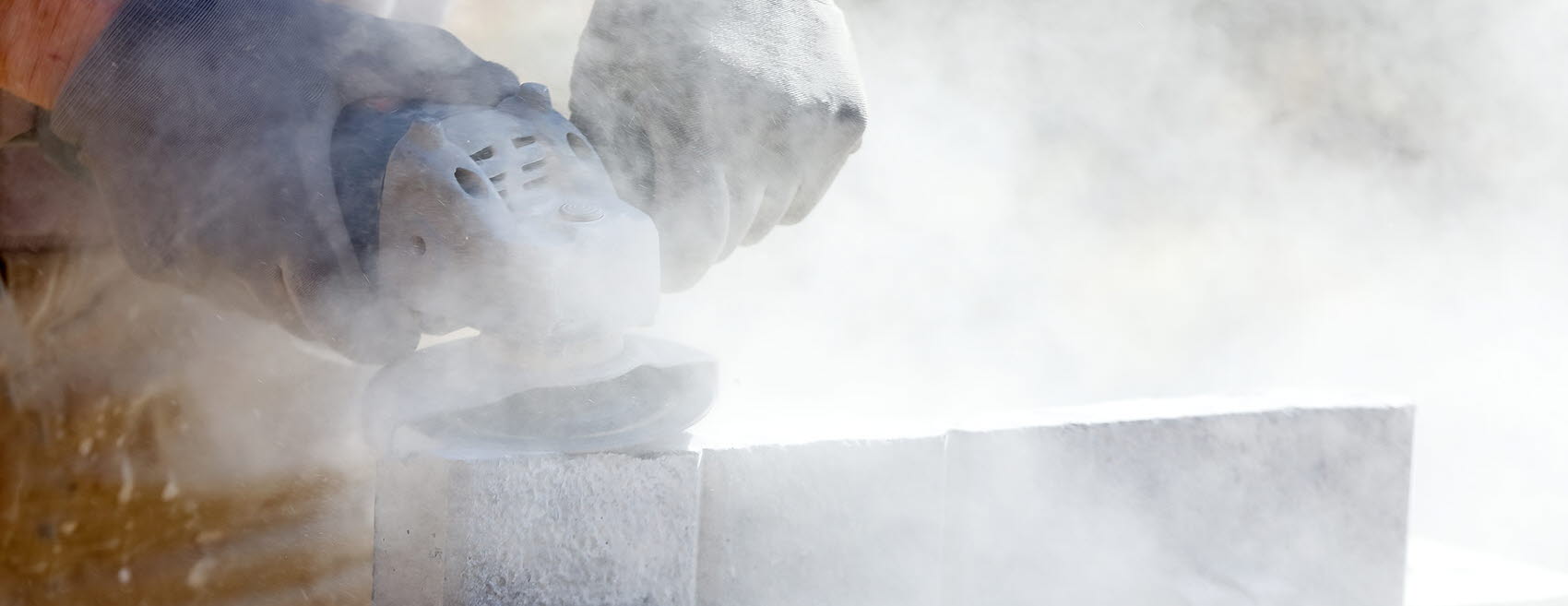 Fotografi: Bearbetning av en sten med en slipmaskin, slipdammet yr.