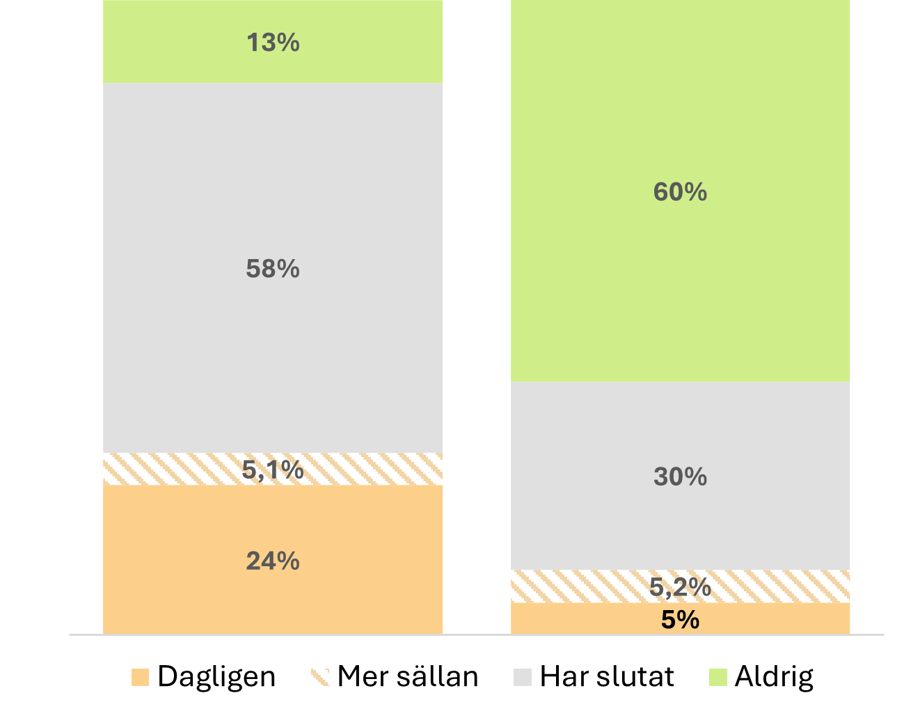 Figur 12.3 visar andelen av befolkningen i Stockholms län, med eller utan KOL, som rapporterar att de röker. Figuren illustrerar att rökning är vanligare bland personer med KOL (24 % röker dagligen) jämfört med de utan KOL (5,1 %). Dock är det 13 % av de med KOL som aldrig rökt