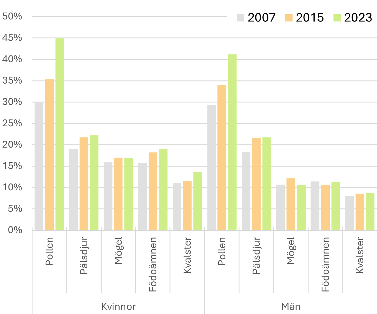 Mer än hälften av den vuxna befolkningen i Stockholms län (53 procent) rapporterar att de är allergiska eller känsliga mot något allergiframkallande ämne såsom pollen, pälsdjur eller födoämnen. Vanligast är allergi mot pollen som har ökat över tid från 30 procent år 2007, 35 procent år 2015, till 43 procent i den senaste enkäten 2023. Kvinnor rapporterar pollenallergi i något högre utsträckning än män (45 procent jämfört med 41 procent), men förekomsten har ökat hos båda könen (figur 12.1). Efter pollen är allergi mot pälsdjur vanligast (22 procent), följt av födoämnen (15 procent), mögel (14 procent) och kvalster (11 procent). Allergi mot födoämnen, mögel och kvalster är även de vanligare bland kvinnor jämfört med män, medan förekomsten av pälsdjursallergi är lika bland könen (figur 12.1). För dessa allergier ses ingen betydande ökning jämfört med 2015.