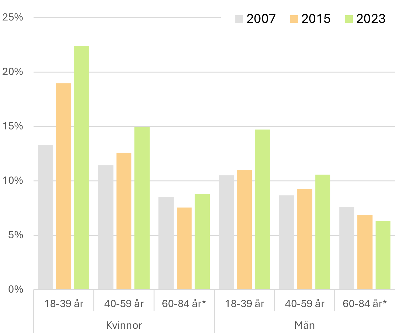 Figur 12.6 visar andelen av befolkningen i Stockholms län som rapporterar handeksem, 2023 jämfört med 2015 och 2007, uppdelat på kön och ålder. Figuren visar en tydlig ökning av handeksem hos unga kvinnor (från 13 % år 2007, 19 % 2015 till 22 % år 2023). Förekomsten har även ökat hos unga män, från 11% 2015 till 15 % 2023 medan förekomsten är lägre i de äldre åldersgrupperna.