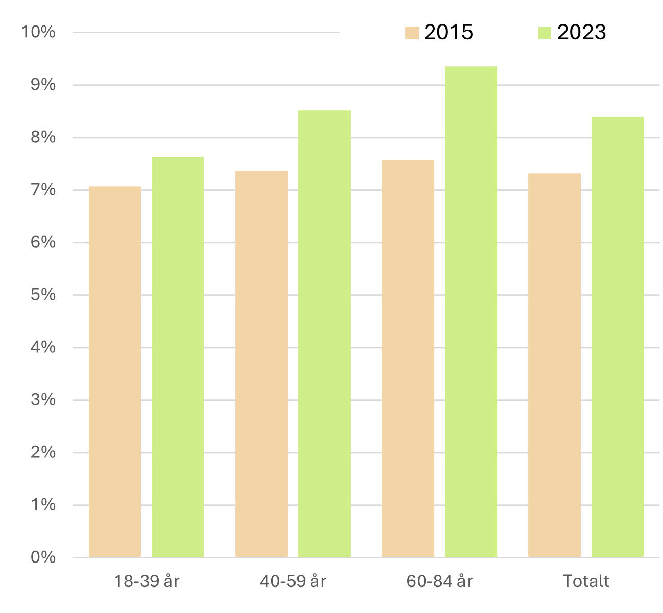 Figur 12.1 visar andelen av befolkningen i Stockholms län som rapporterar att de har astma år 2023 jämfört med 2015 uppdelat på åldersgrupp. Av figuren framgår att förekomsten av astma har ökat från 7,3% år 2015 till 8,4% år 2023. Förekomsten har ökat i alla åldersgrupper, men med den största ökningen i den äldsta åldersgruppen 60-84 år från 7,6% år 2015 till 9,4% år 2023.