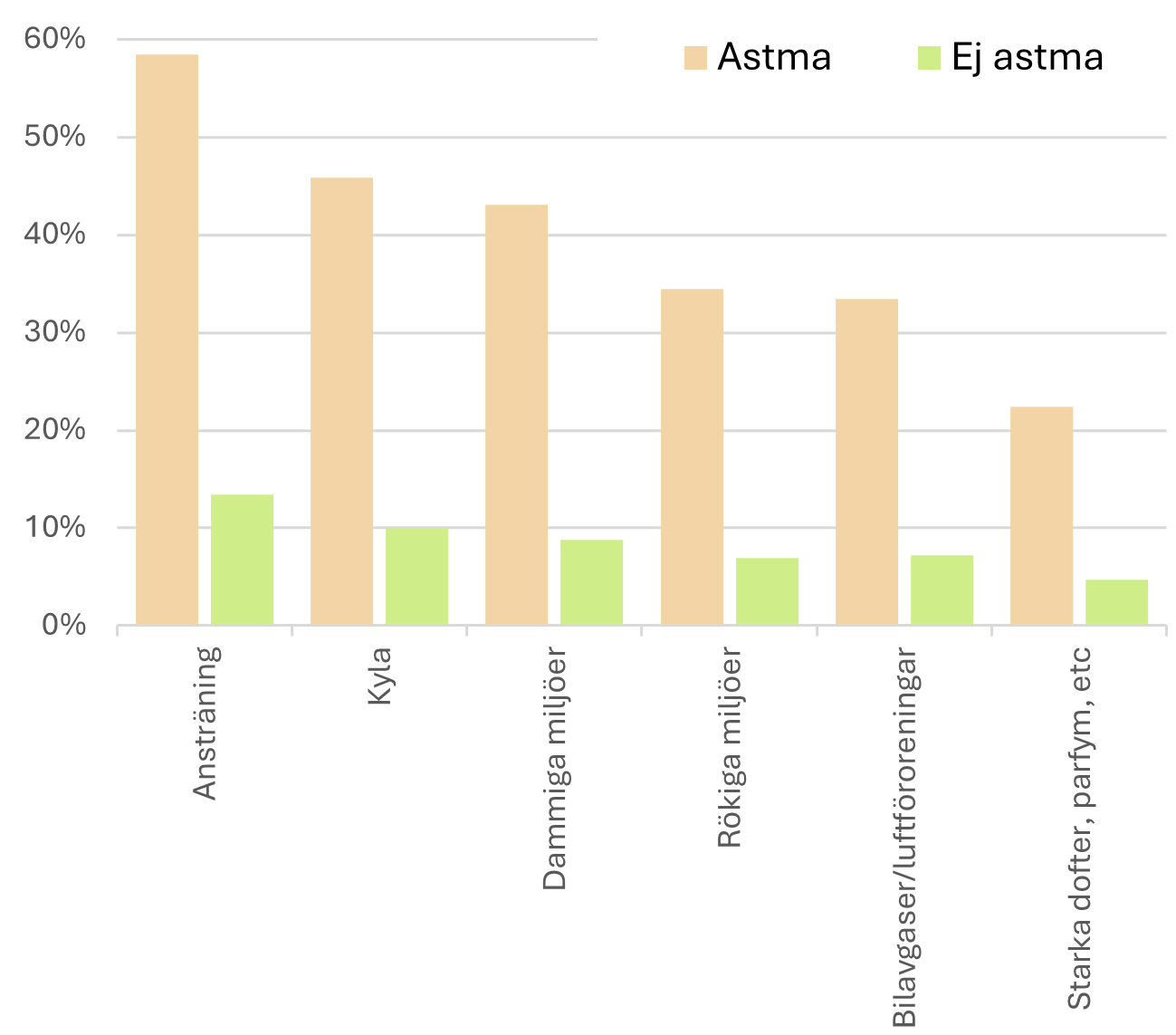 Figur 12.2 visar andel av befolkningen i Stockholms län, med eller utan astma, som rapporterar att de under det senaste året har fått andningsbesvär eller svår hosta i samband med ansträngning eller miljöexponeringar. Av figuren framgår att det finns en stor skillnad i rapporterade besvär mellan individer med och utan astma, där individer med astma rapporterar högre förekomst av besvär. Vanligast är besvär av ansträngning följt av kyla och därefter dammiga miljöer. Mer än hälften (58,5%) av individerna med astma rapporterar besvär vid ansträngning medan motsvarande siffra för individer utan astma är 13,5%.