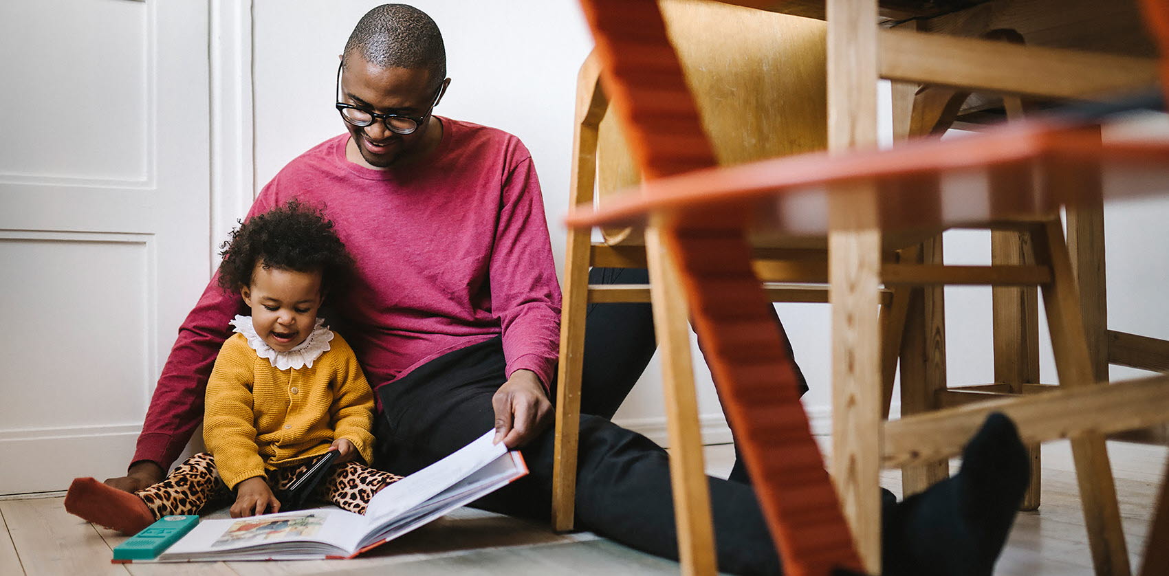 Fotografi av en pappa som öäser för sin dotter sittandes p¨å köksgolvet.